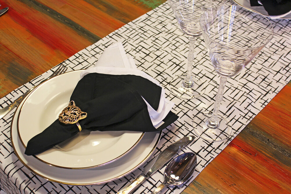 O clássico Flamingo Sofia, com filete em ouro, faz par com um moderno trilho de padronagens geométricas. A cor preta dá ainda mais sofisticação para essa mesa posta.