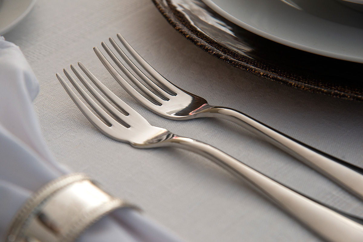 Vamos falar de talheres? Não deixe que a quantidade de peças te assuste, porque não é assim tão difícil quanto parece. Na realidade, a disposição dos talheres segue a ordem dos pratos servidos, de fora pra dentro. Ou seja, o primeiro talher de fora é para o primeiro prato servido (a entrada) e assim sucessivamente. Quando você for arrumar a mesa, lembre-se de que facas e colheres ficam na direita e garfos na esquerda. As facas devem ser posicionadas com a lâmina virada para o prato.
