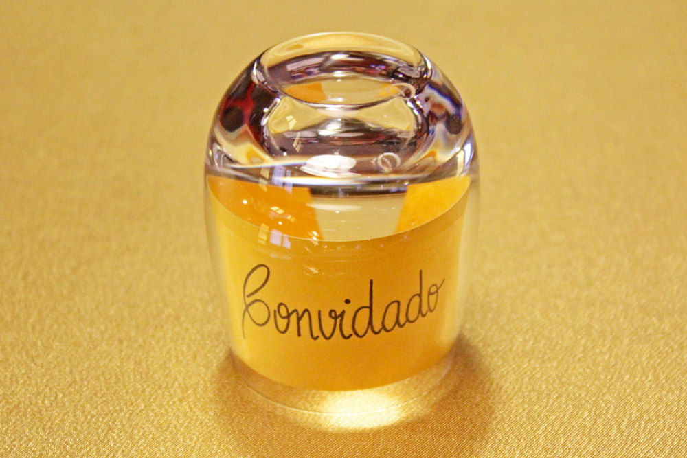 Um copo de cristal pequeno e uma tira de papel. Uma ideia simples e elegante para um marcador de lugar personalizado.