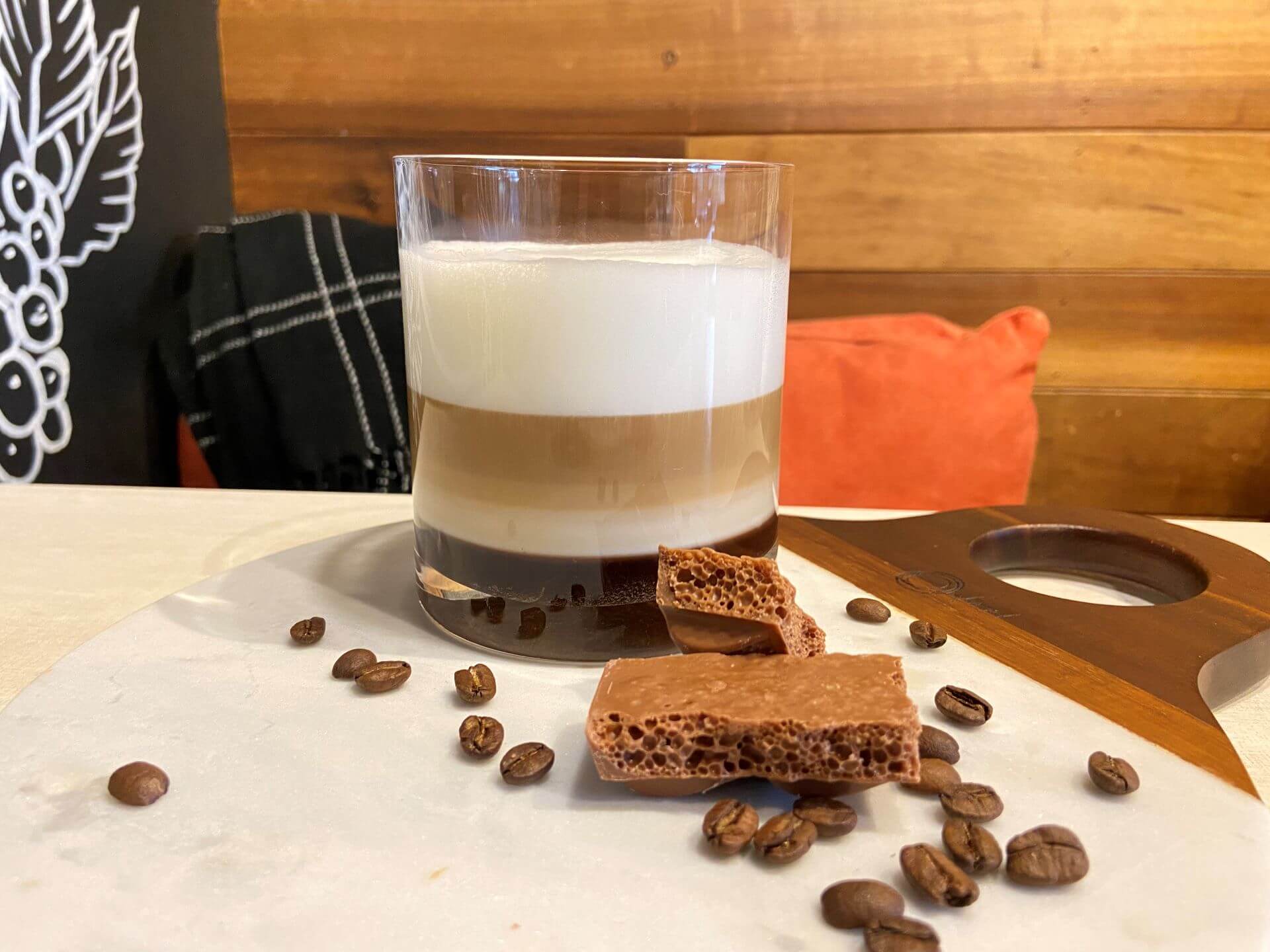 Para um copo, aproximadamente 50 ml de cada camada é o suficiente. Adicione as três camadas na seguinte ordem e a bebida estará pronta: leite vaporizado com espuma, calda de chocolate e expresso. A calda e o expresso descem naturalmente pela diferença de densidade.